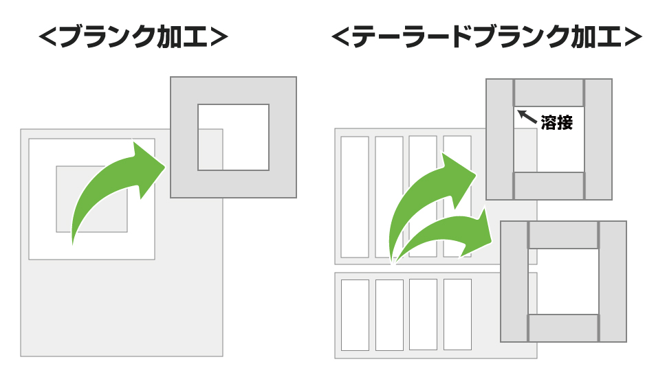 テーラードブランクとは、異なる種類の鋼板をつなぎ合わせて一つの形状を作ることを言います。特徴として、一つの製品の中で特性を部分的に変化させることができます。このような特徴から、箇所によって異なる強度や耐久性が要求される自動車ボディの加工法として知られています。 弊社ではこのテーラードブランク工法の発想をもとに、もともとひとつのブランク加工であった製品を、複数のパーツにわけて後で溶接するという加工法の提案も行っています。これにより、一定の材料からとれる製品の数が増加し、歩留りが大きく改善するので、特に高価な材料の場合は大きなコストダウンにつながります。 もちろん、本来のテーラードブランク工法のように部分的に異なる材質を使用することで、部分的に製品特性を変えることも可能です。また、レーザ加工により切断端面の精度が増すことにより、他部品との溶接や組立においても優位性を担保できます。 → 「レーザー加工がもたらすメリット」に戻る