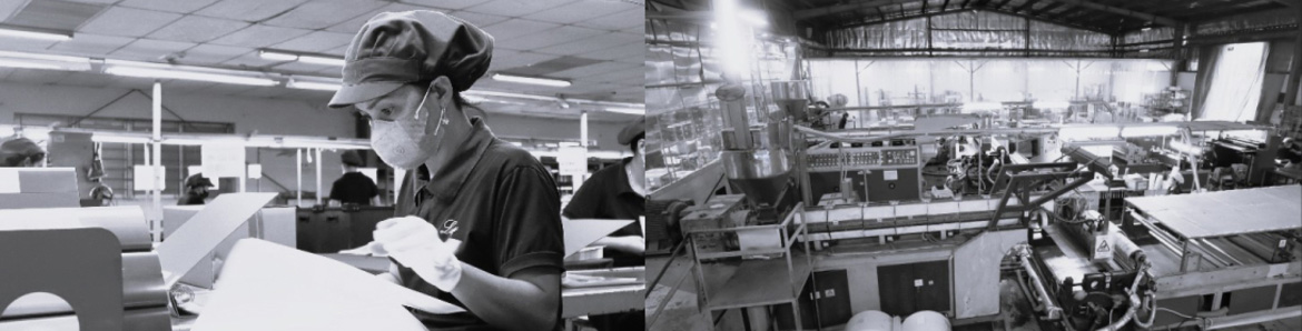 シート押出成形、インフレーション成型、トムソン抜き、超音波溶着、高周波溶着、箔押し、シルク印刷、UVインクジェット印刷